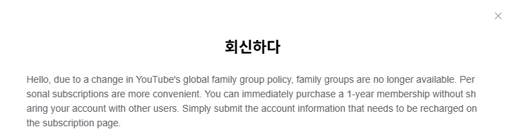 최근 구글의 유튜브의 정책 변경으로 더이상 가족 멤버십을 사용하지 못하게 되면서